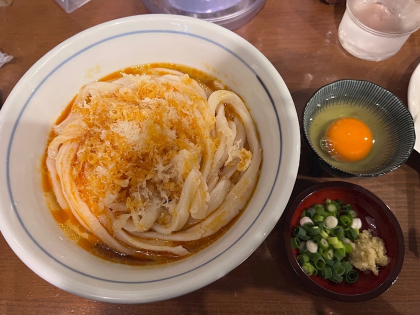 ラー油揚げ玉醤油うどんに生卵トッピング