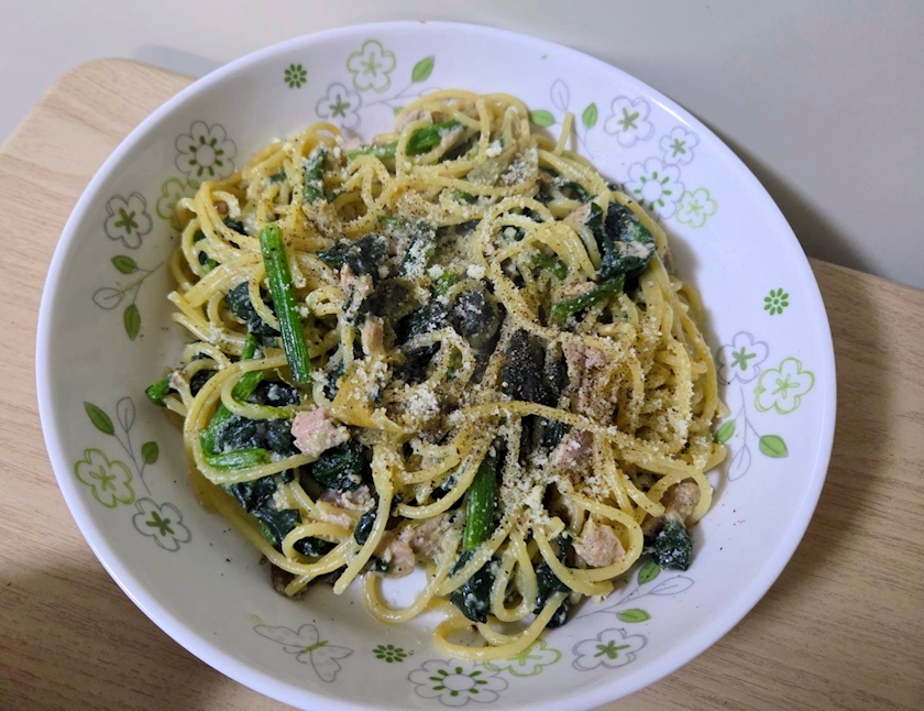 ほうれん草とツナ缶を入れてパスタを作りました♪♪