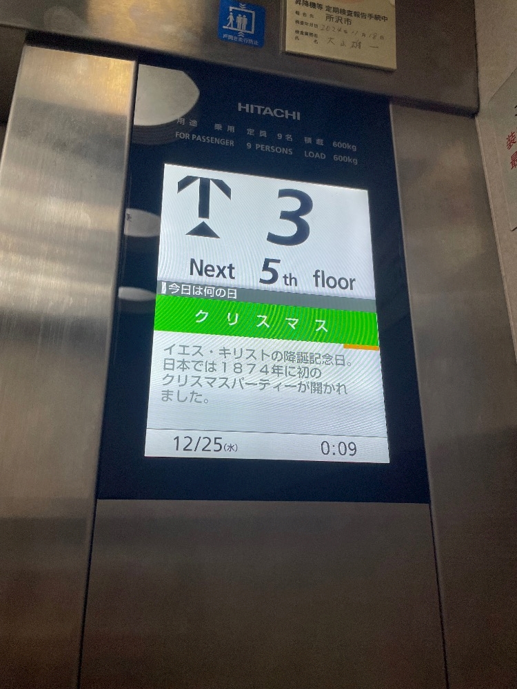 お店のエレベーター、毎日今日が何の日か教えてくれるのですが昨日退勤のときに日付を超えてたので記念すべきクリスマス回を撮る事ができました!
