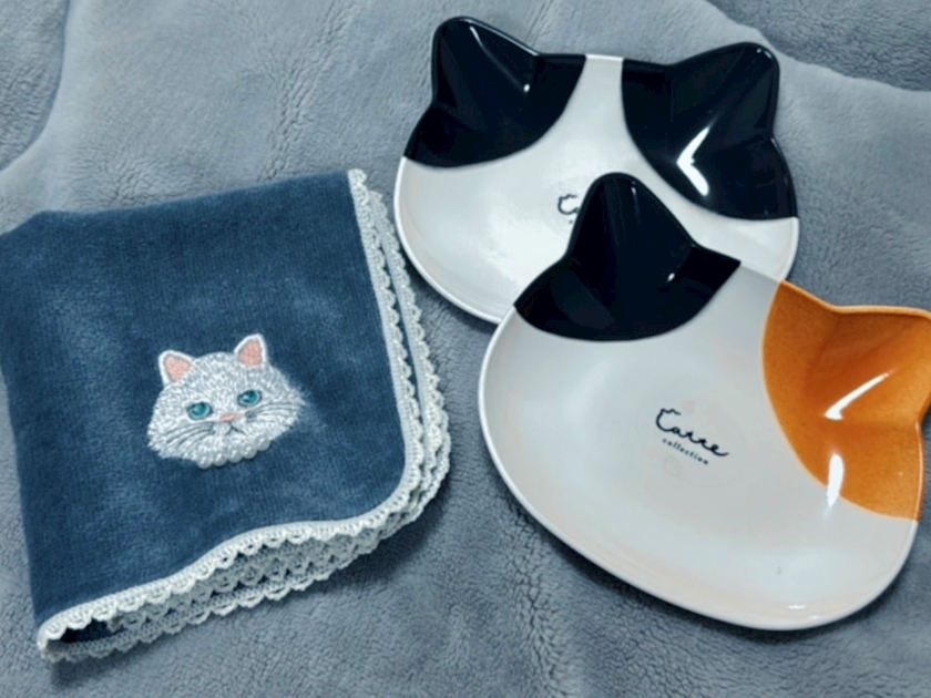 先日、猫ちゃんのお皿やハンカチを購入したら