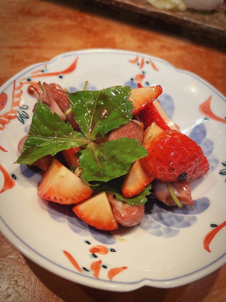 ホタルイカと苺の黒酢和え…🍓🦑