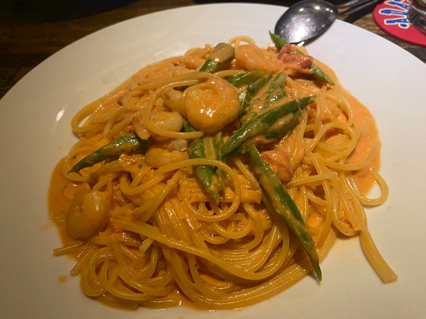 トマトと小エビとアスパラ入ってるクリームパスタと