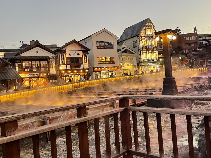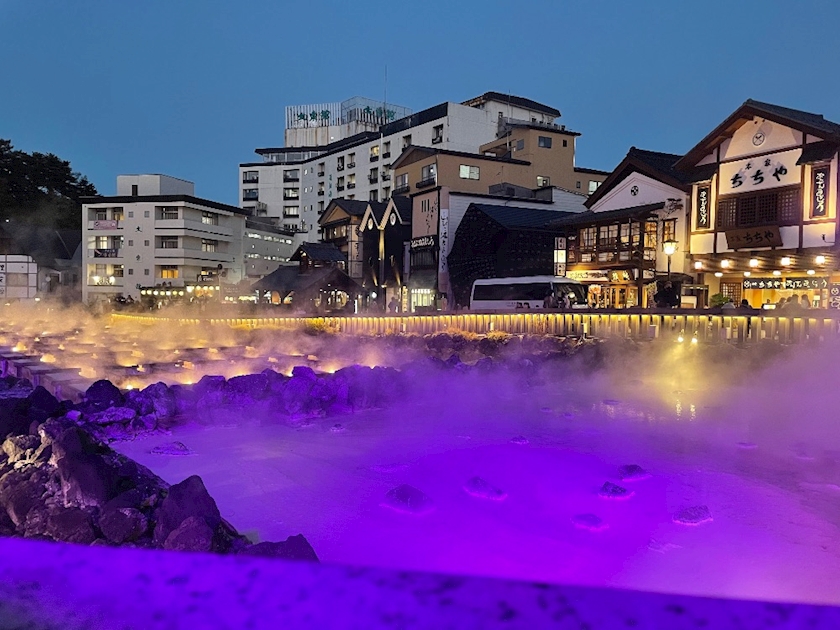 暗くなると湯畑がライトアップ