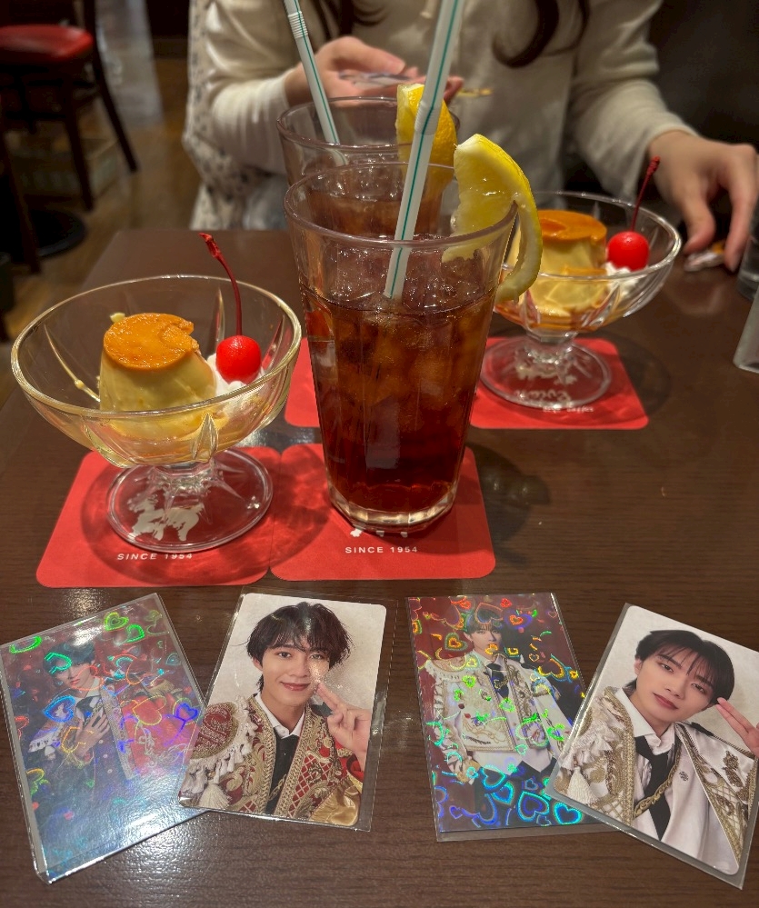 喫茶店のプリン大好き🍮レトロ感あって素敵✨アイスティーにレモン刺さってんのオシャできゃわ🫶でもやっぱ喫茶店ではメロンソーダを頼みたい🍈アイスのってるやつね!!そんでそんで最近お友達に滅のお兄様たちを布教されて見事にハマってます🙂↕️