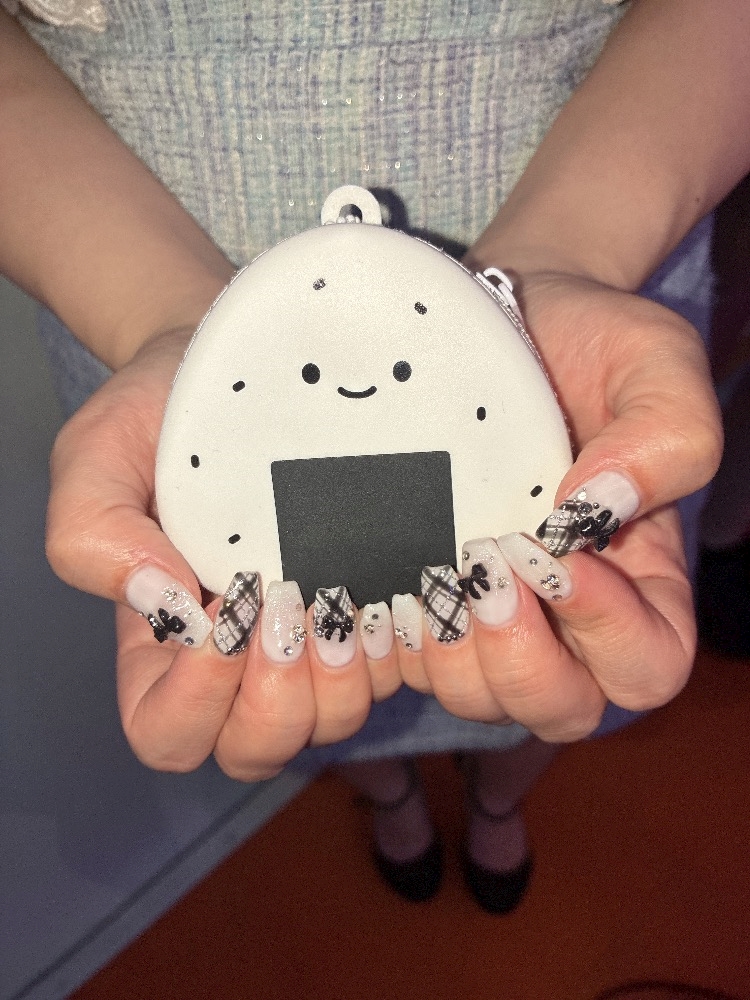 - 言ってた通りネイル変えたよん💅今回は白黒で流行りの可愛い感じにしてもらった🫶写真なかったからおにぎりのポーチと写真撮ってもらった✌️このポーチお気に入りなのよ~🤭このつぶらな瞳が大好き😂え?・が私の目に似てる?誰が目が点やねん😠