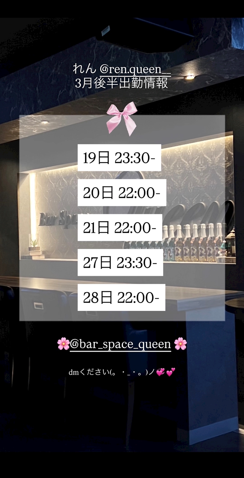 ୨୧ ┈3月後半出勤情報┈ ୨୧ - れん【宇都宮Queen】 - Bar Space Queen・バースペース クイーン - 東武宇都宮のガールズバー