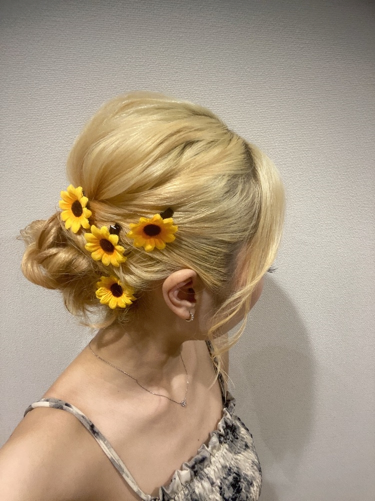 ひまわりの柄の浴衣に、ひまわりの髪飾りつけたの🌻