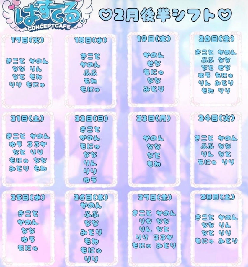 2月後半の出勤予定が出ました〜!!