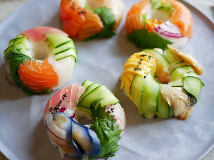 今日はひな祭りに因んで、ちらし寿司とかてまり寿司より簡単な、シリコンのドーナツ型に押しつけて作る押し寿司作ったよー(*ˊ˘ˋ*)