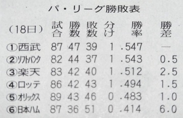 昨日ライオンズが首位になりました。