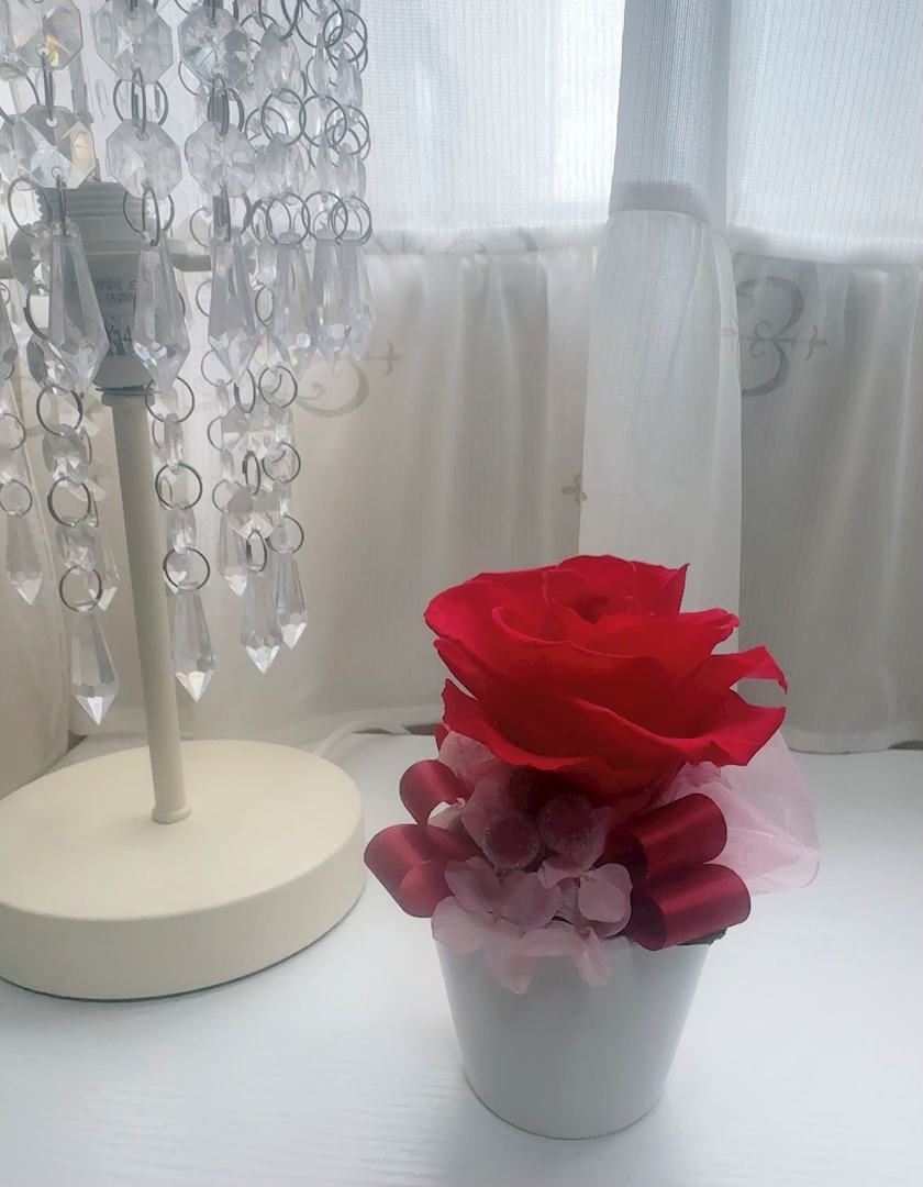 岡村店長からは可愛い赤のバラのプリザーブドフラワー