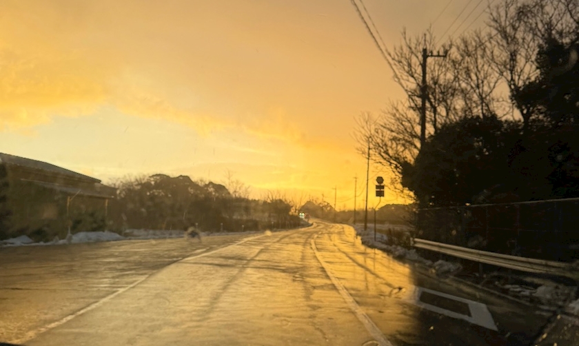 夕焼けが濡れた道路に反射して
