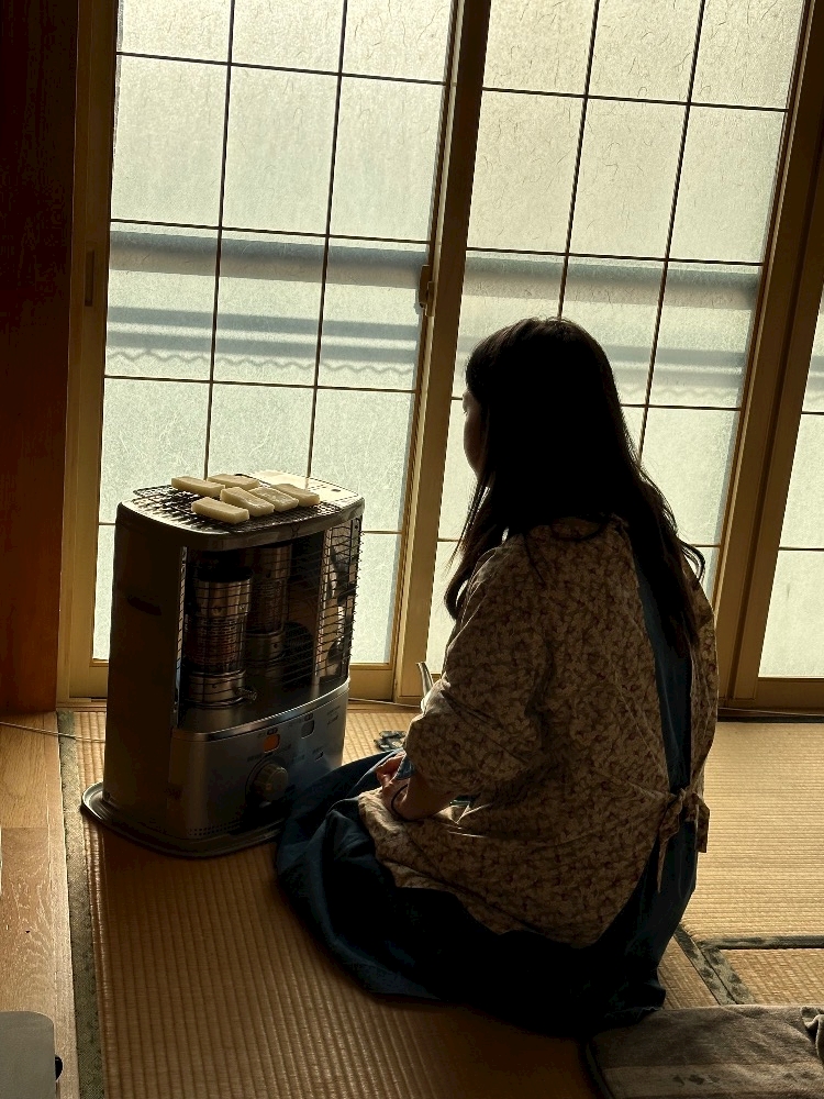 母の実家にて餅焼き当番をするうちの姉でサヨナラ
