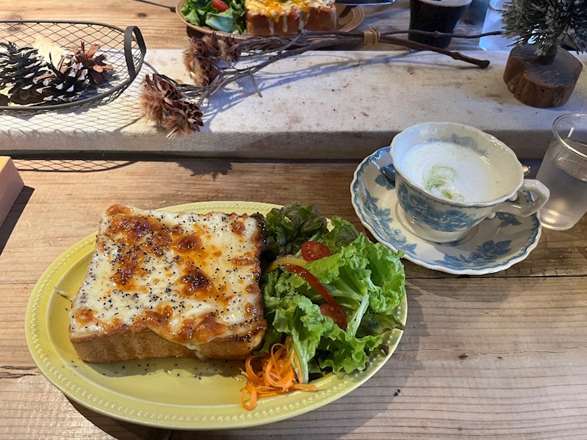 チーズたっぷりのトーストに、シャキシャキのサラダがついたプレート✨