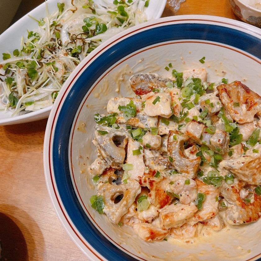 蓮根と鶏ムネをマスタードマヨで