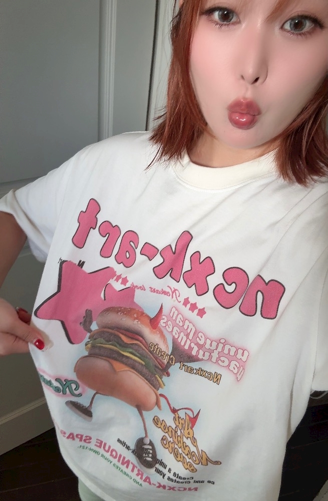 唇と一緒にお気に入りのTシャツも見せたい様です。