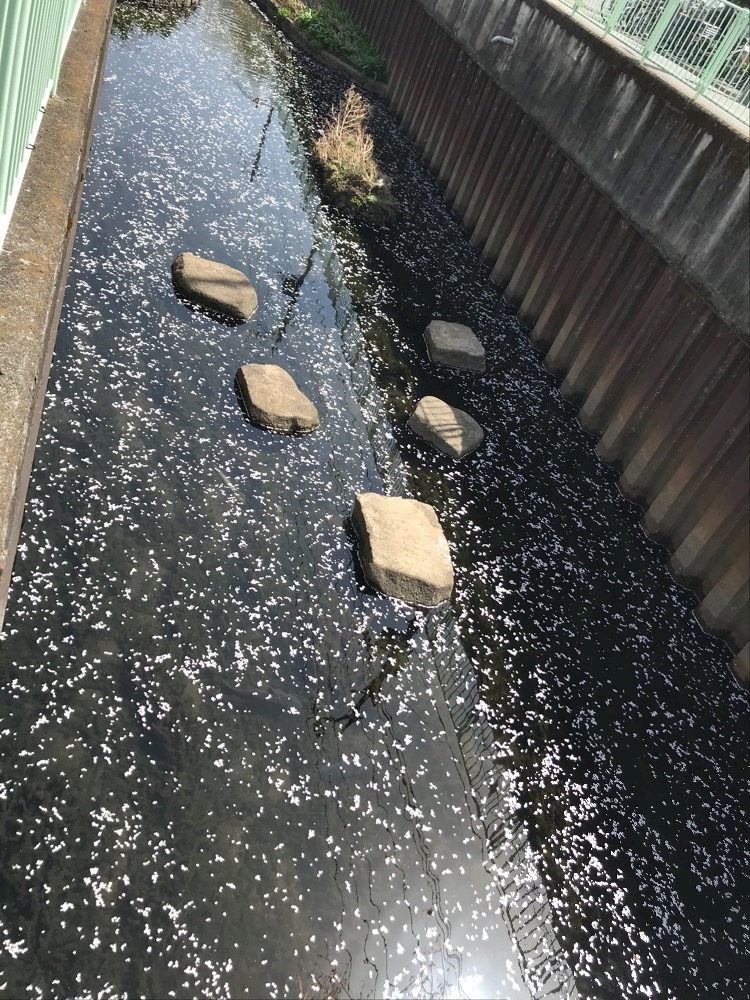 桜の花びらが流れる川沿いを