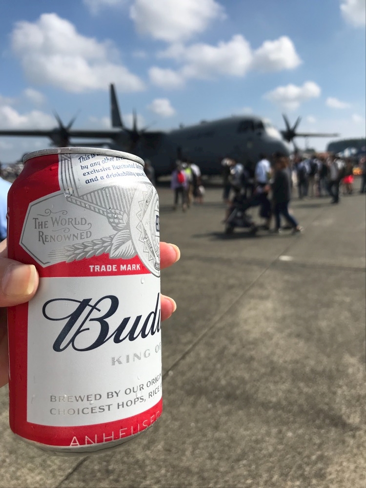 輸送機を眺めながらのバドワイザーは
