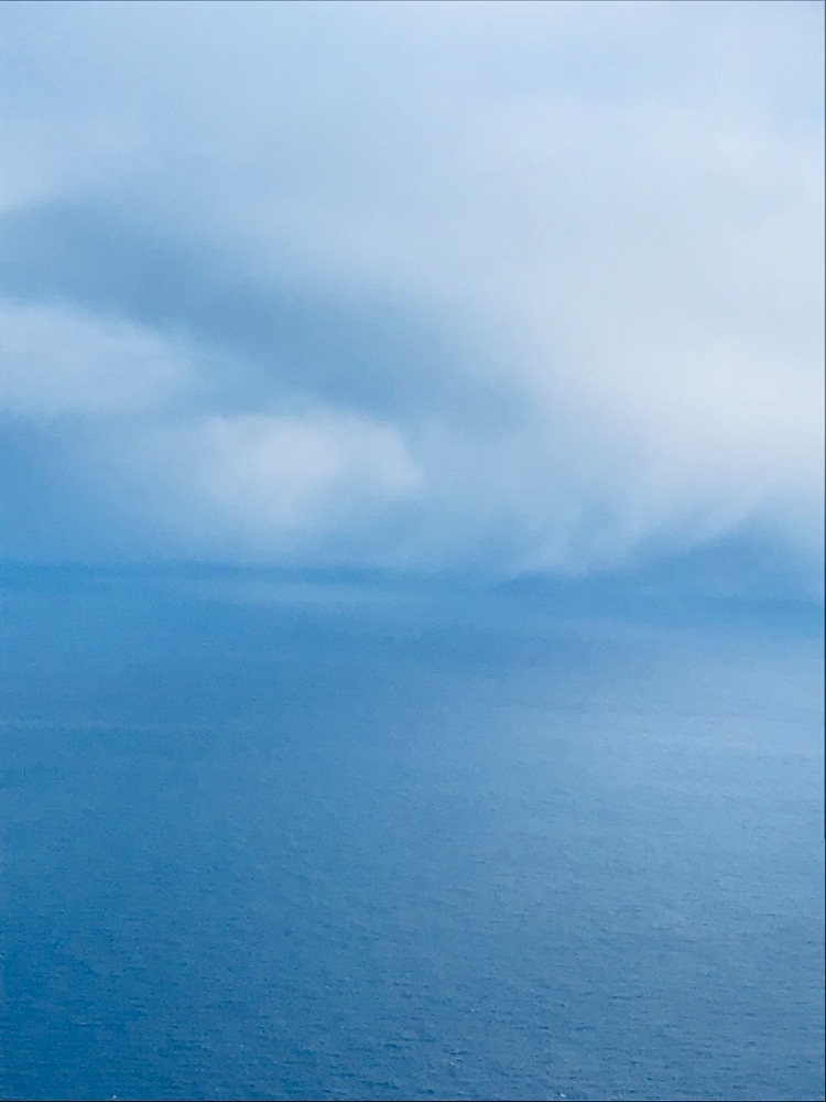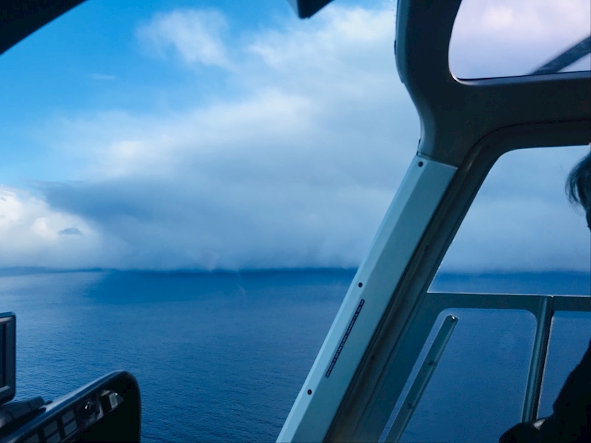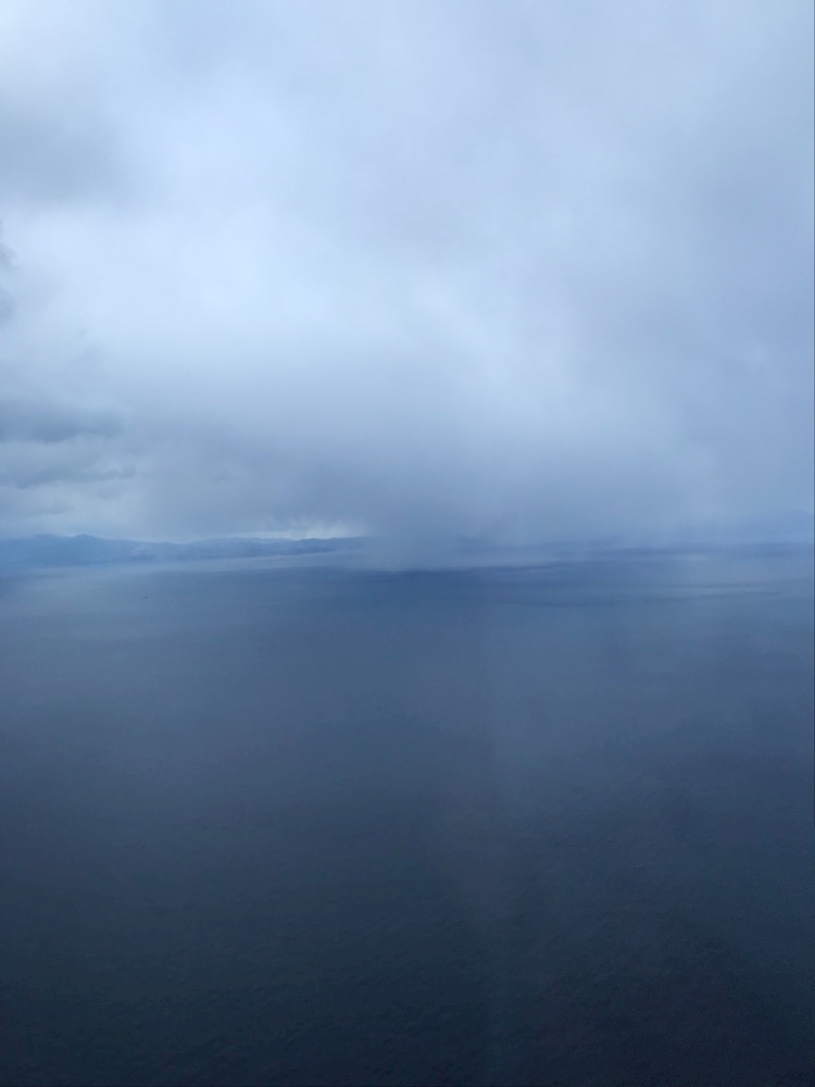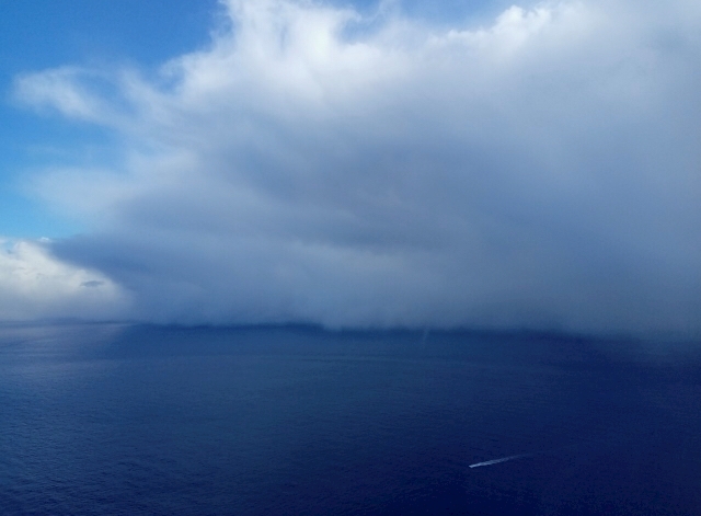 分厚く海面まで伸びる雲が