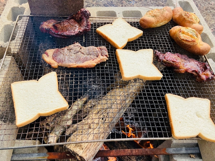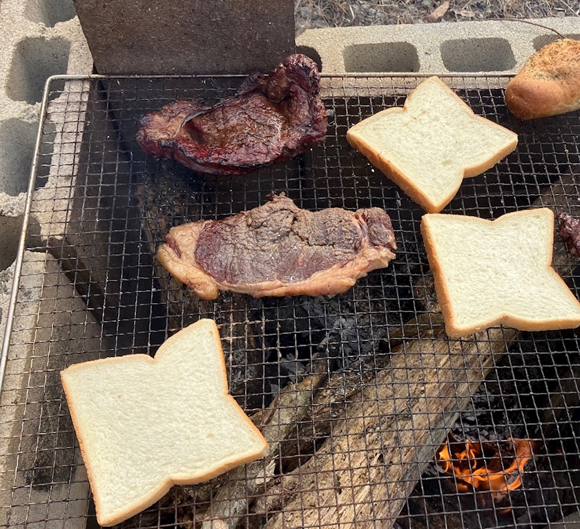 ステーキ肉を薪で焼いて