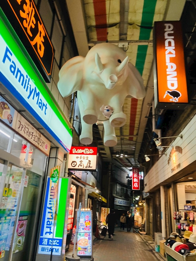 [吊るされるゾウ]の下を通って