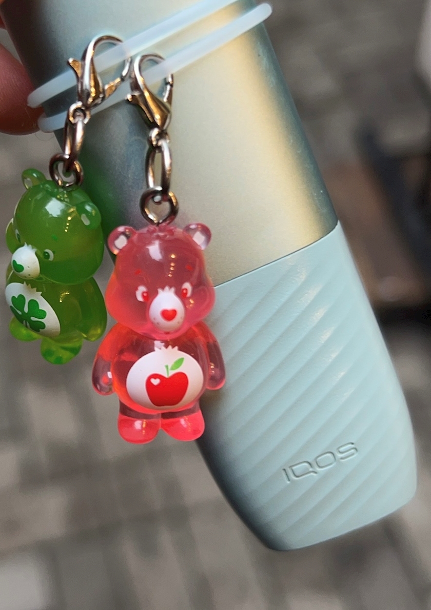 諦めてピンクと緑のベアちゃんをつけてるよ🎶