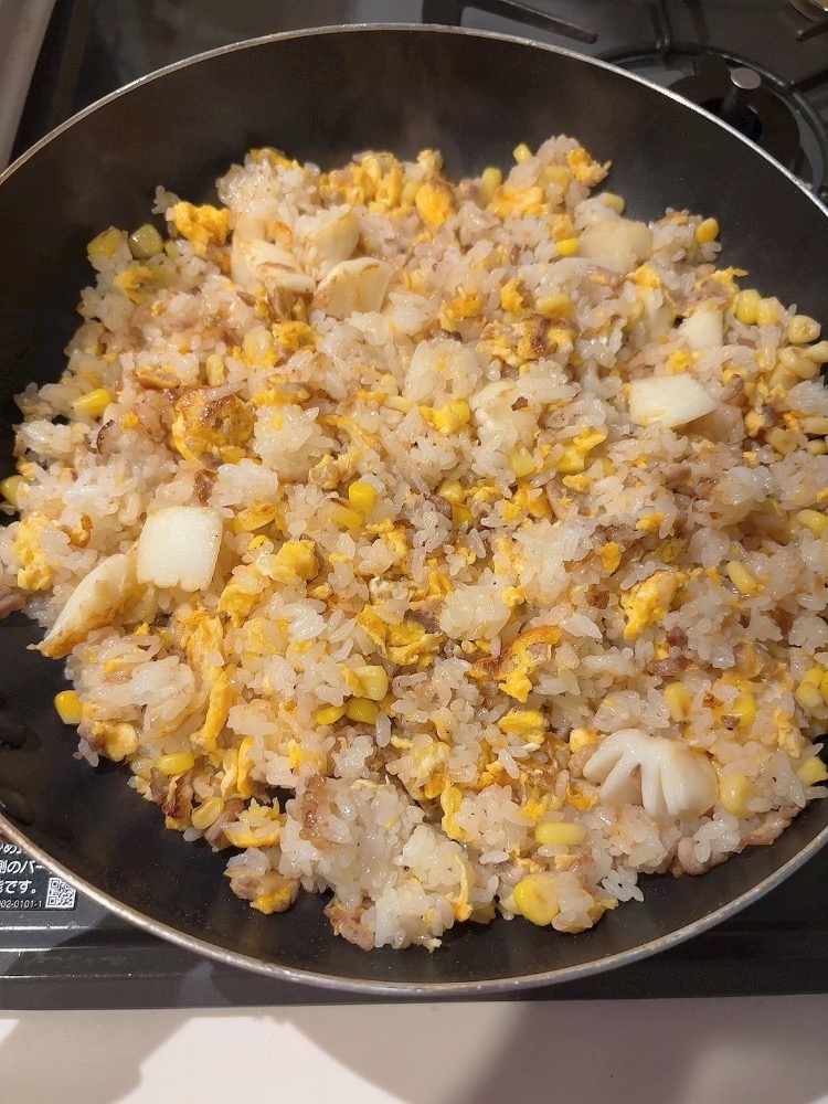 それで、お腹すいたな〜ってことで冷蔵庫にある物を色々入れて、炒飯作って食べました🍳
