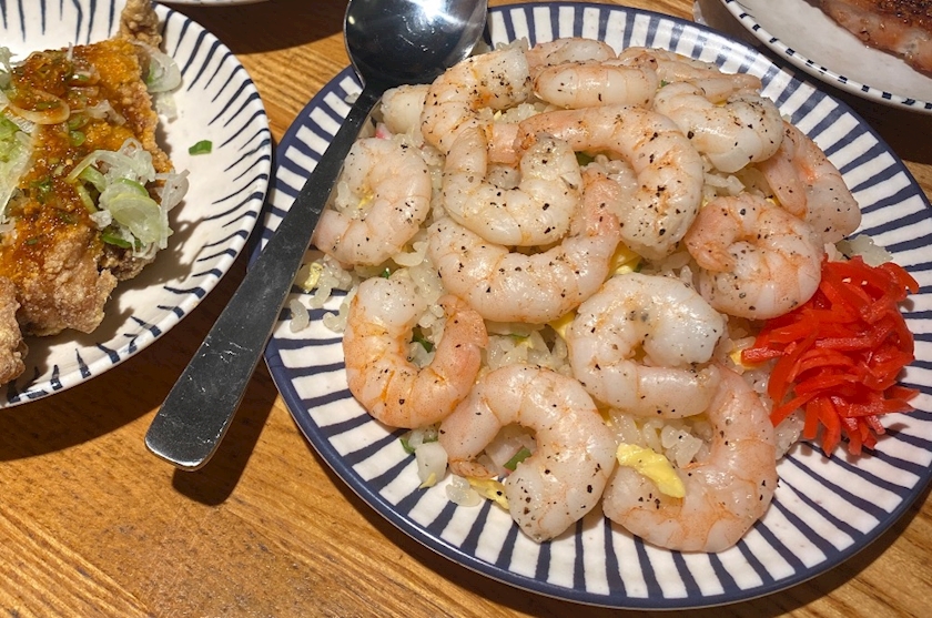 これは先週末に居酒屋さんで出会ったえびたっぷりチャーハンです。さらにえび増しトッピングしてます。