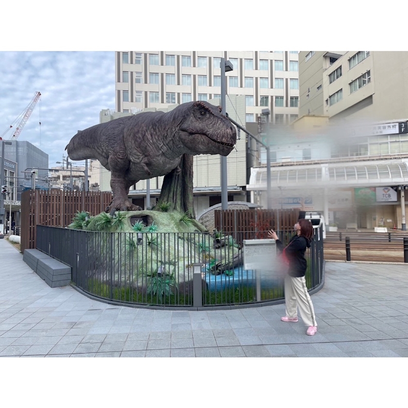 ⬆️福井駅前の恐竜と戦うわたし🦕