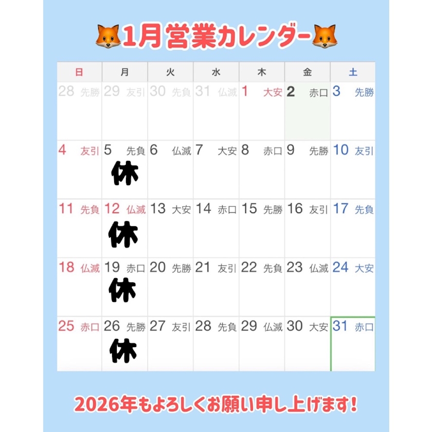 2026年1月営業カレンダー1️⃣ - めいか 📛 メギツネトーキョー @ 巣鴨 - メギツネトーキョー・メギツネトーキョー - 巣鴨のガールズバー