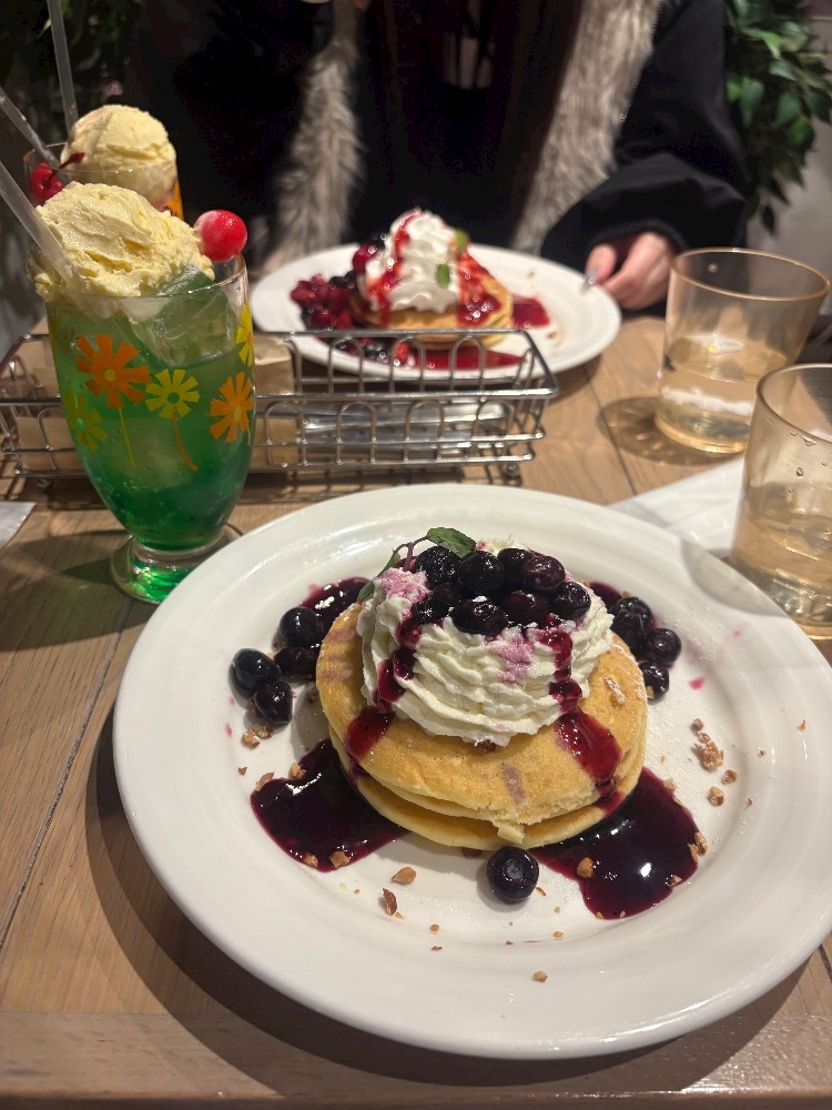 ブルーベリーのパンケーキとクリームソーダ飲んで幸♡
