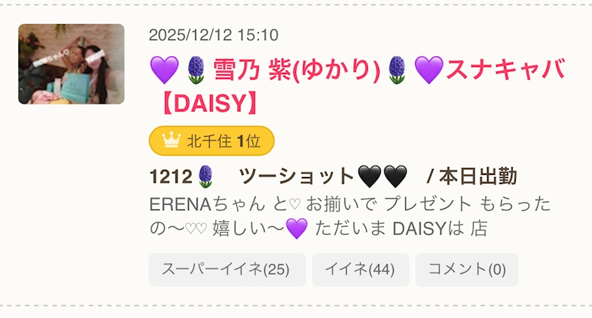 1213🪻 昨日もありがとうございました💜 来店お礼💜 本日出勤💜 イイネ・スーパーイイネお礼入り💜 - 💜🪻雪乃 紫(ゆかり)🪻💜スナキャバ【DAISY】 - DAISY・デイジー - 北千住のキャバクラ