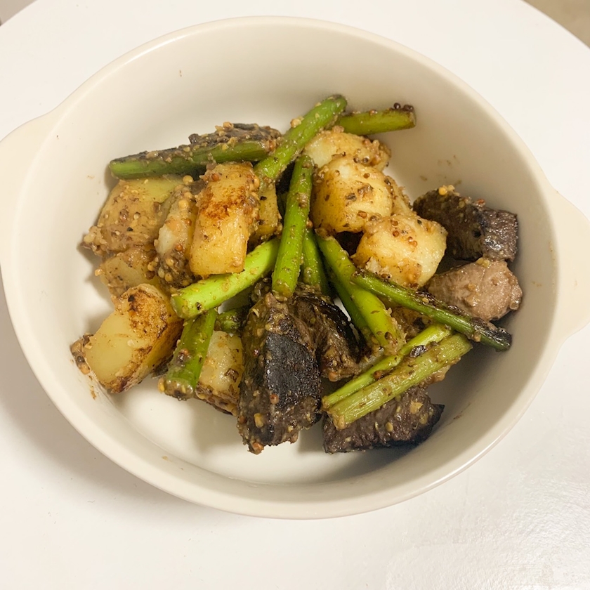 マグロの血合いが大好きで手に入るととても嬉しい。外でもそこそこ頼む。マグロの血合いのレシピを調べると竜田揚げや煮付けばかり出てくるのだが、実はステーキなどの炒め物が一番ぷりぷりと食感がジューシーでうまい。そういうわけでジャーマンポテトはうってつけだ。