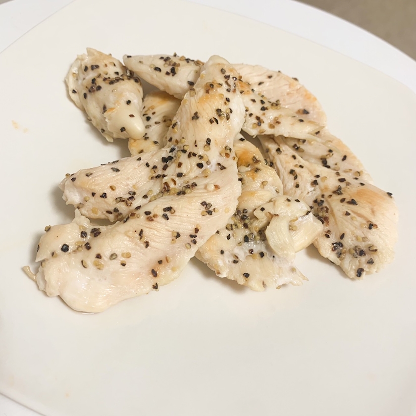 塩を振ったささみの半身をじりじりと油も引かずに焼くだけというごくごく単純がゆえに時間の流れがゆったりとするレシピ。ポイントは厚みを半分にすることくらい。