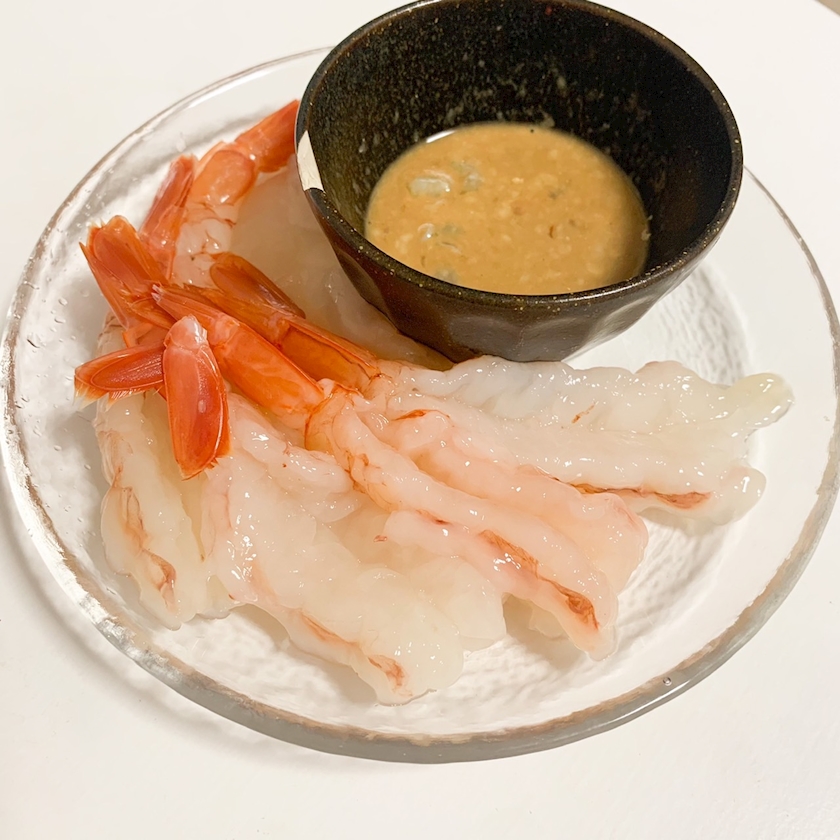 赤えびは本当は焼きがいちばんうまい調理法なのだけど、エビの刺身食べたさによく生で食べてしまう。いつもはほじくるだけの味噌を今回はちょっとの醤油で伸ばしてタレ風にするなど。