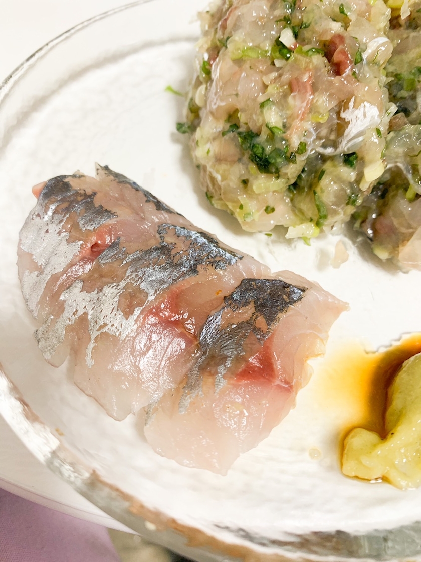 アジは塩なめろうと刺しの2種拵えたのだが、刺しの絵面がよかったことで最近アジの扱いがうまくなってきているのを感じたのでなめろうは背景と化している。