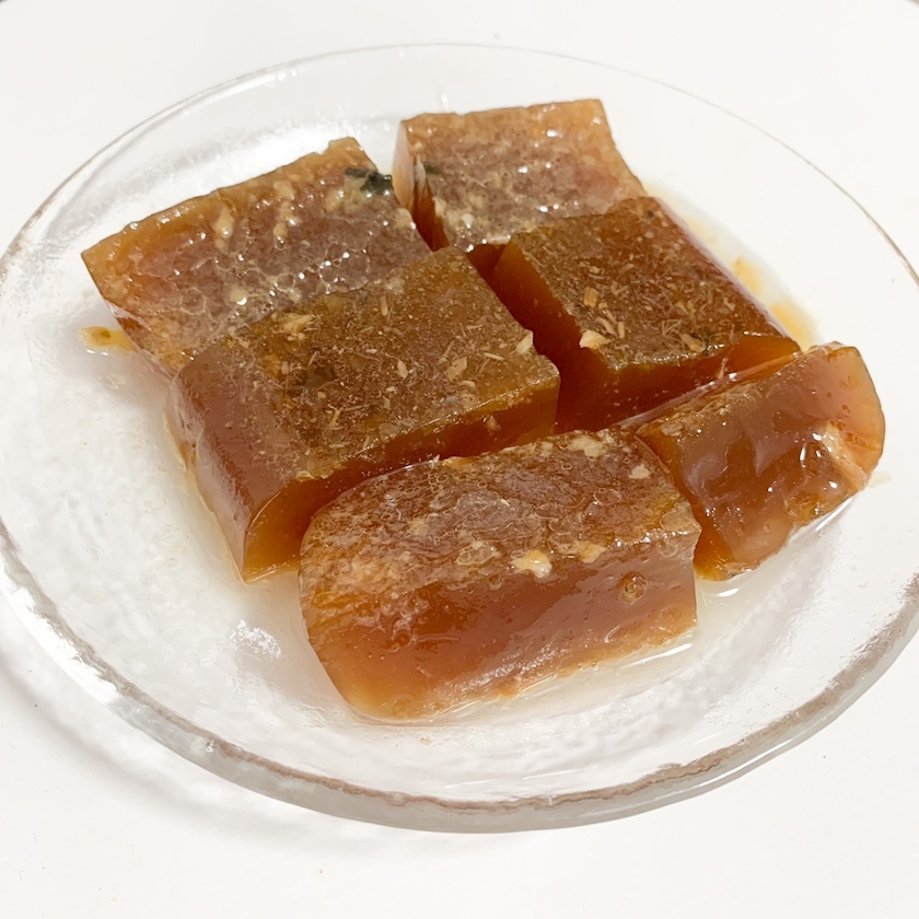 ぶり大根を作って残った煮汁を冷やし固めた。だがしかしこれだけで酒が飲めるのはありがたい。
