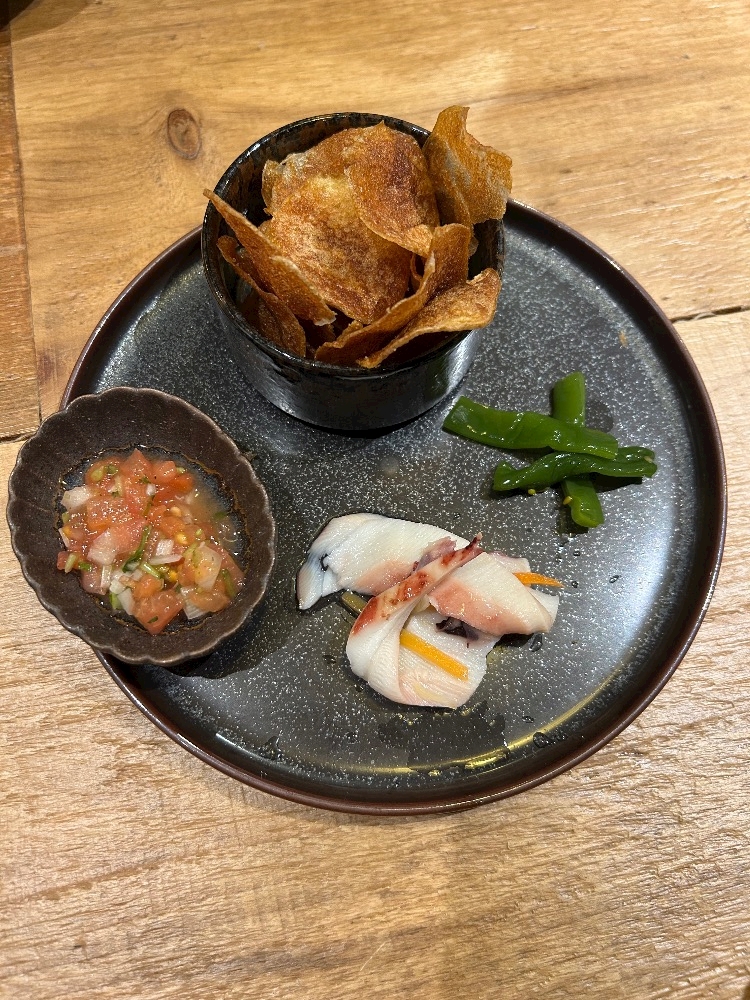 お通しは手作りのポテチに和風サルサ🍅