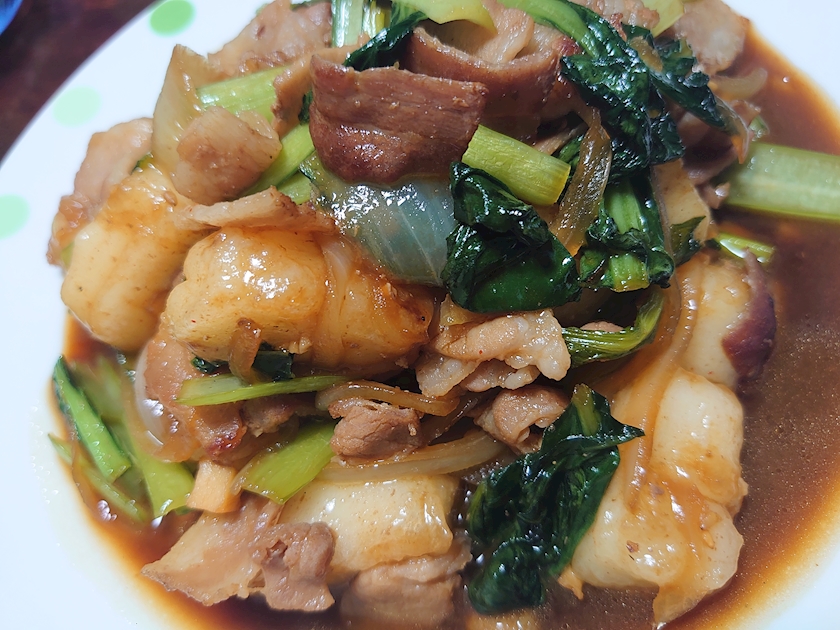 小松菜とお餅揚げたのと豚バラと玉ねぎで