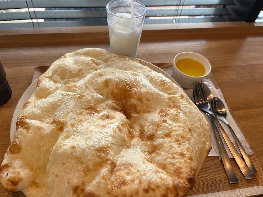 ナンが大きすぎて見えてないですがこの下にカレー2つとサラダが隠れてます👀