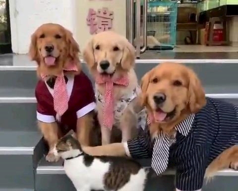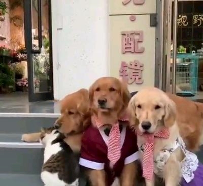 ワンちゃんが、記念撮影で後ろを向いてるニャンちゃんに