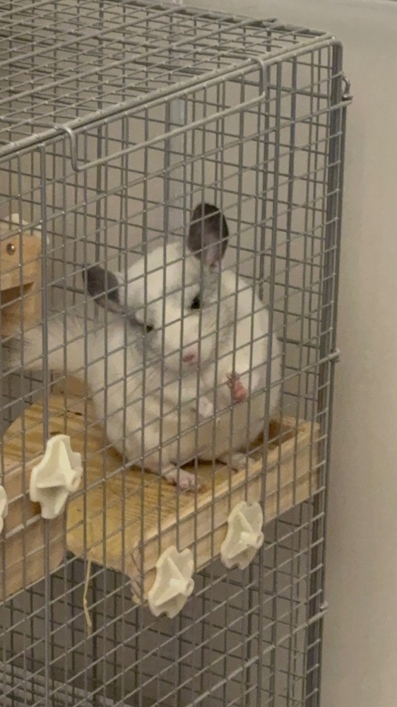 首傾げて片手でケージ持って