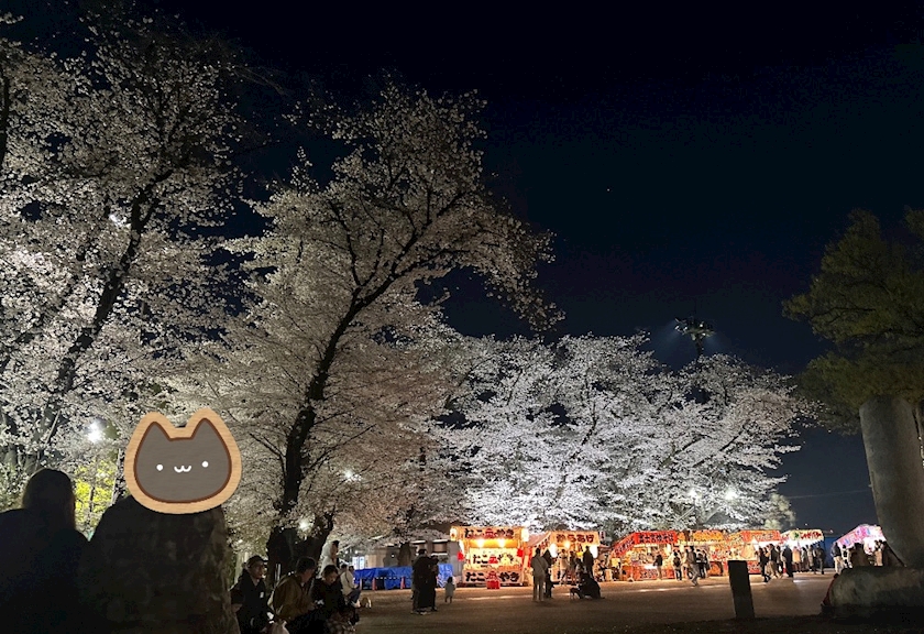 ライトアップの屋台と桜も