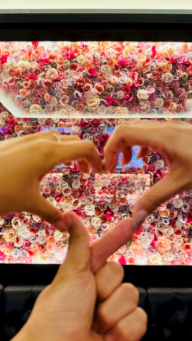 壁一面にある赤とピンクの花がインスタ映えする!