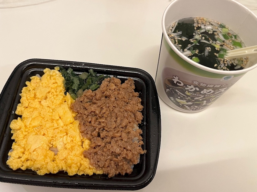 キッチンカーの食べたかったルーロー飯が売り切れだったのでファミマさんの2食ごはんとわかめスープ🥹🥹🥹ちょうど良いサイズ感wwww