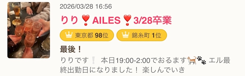 最後のブログ! - りり❣️AILES❣️3/28卒業 - AILES・エル - 錦糸町駅南口のガールズバー