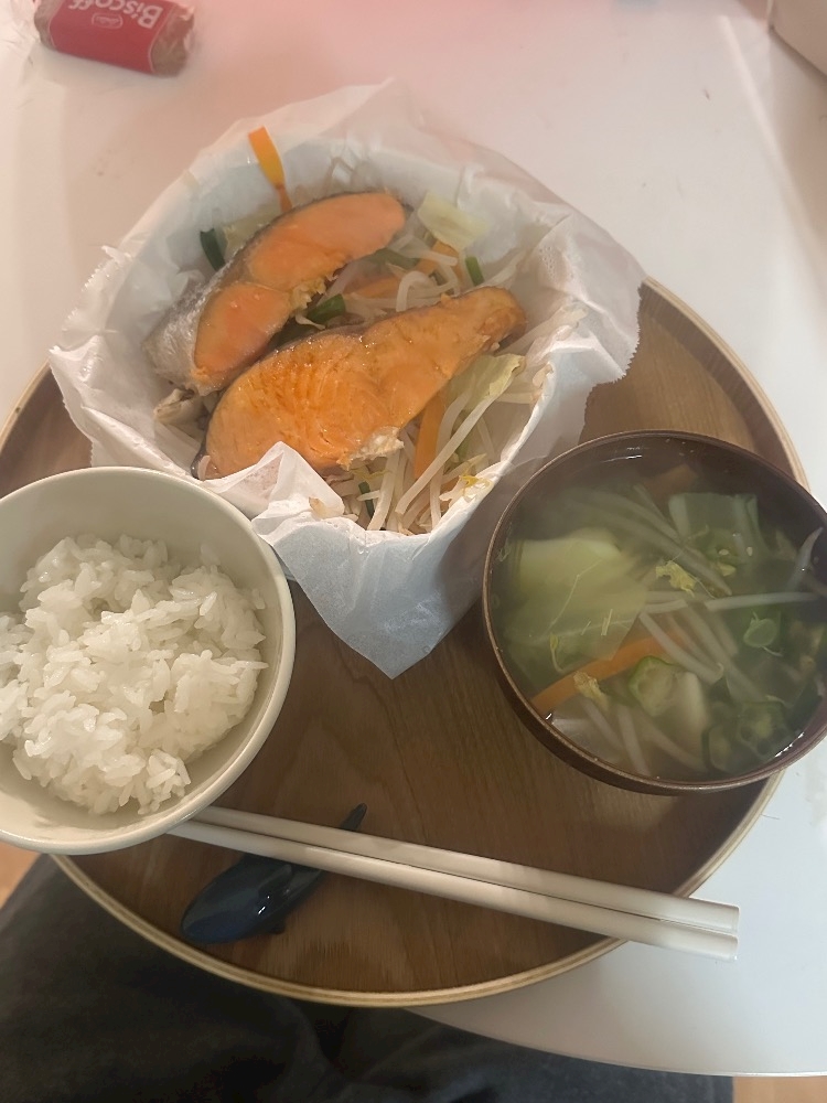 時間なかったので鮭蒸してスープ作っただけ