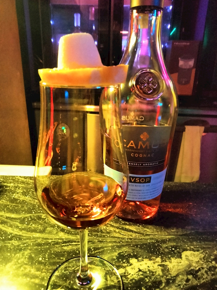ストレートのブランデーを入れたグラスに