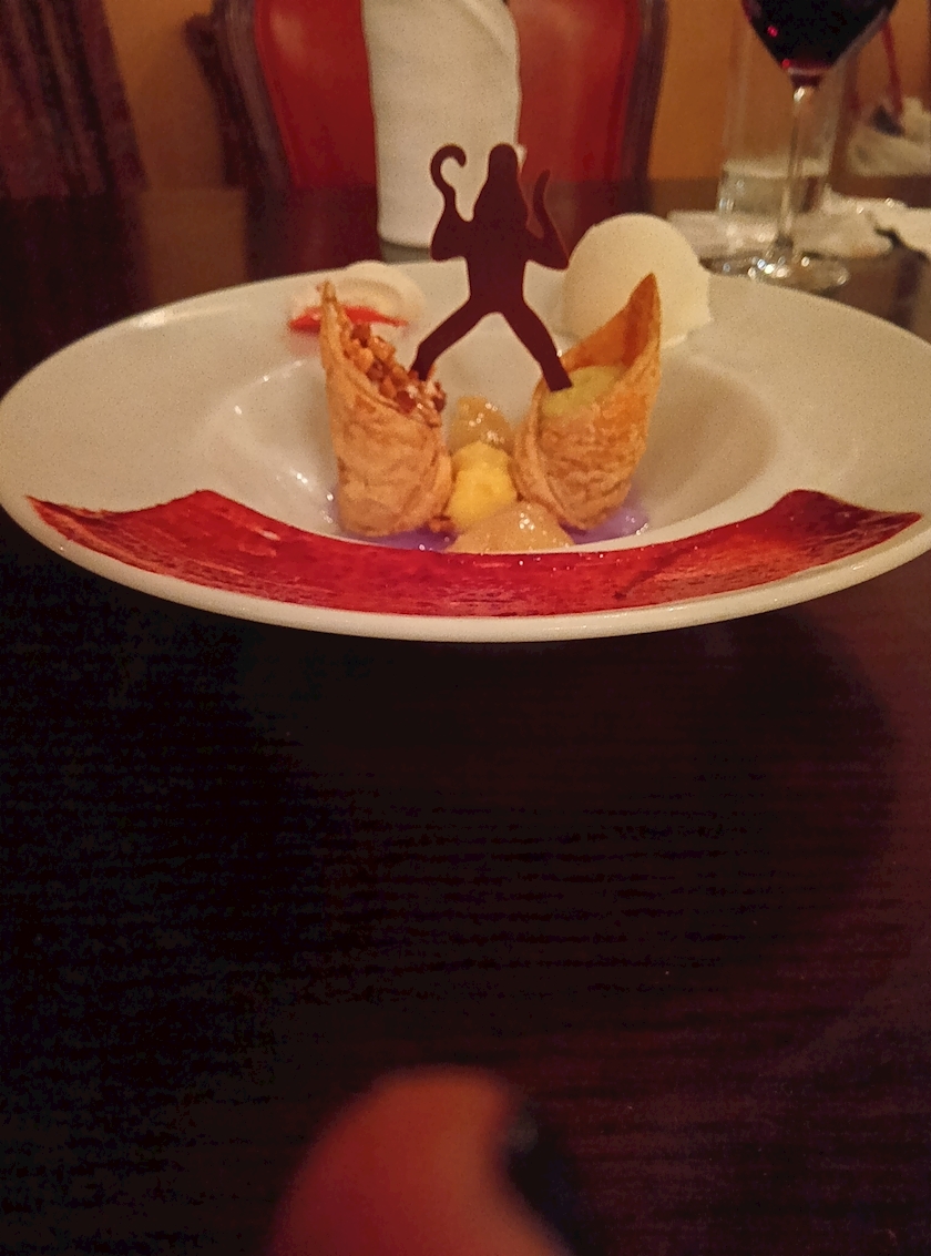 ピーターパンのストーリーをイメージしたコース料理の最後がワニに食われそうになってるフック船長のシーンのデザートでした