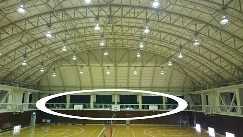 片付けの最中に体育館の上の通路みたいなところ